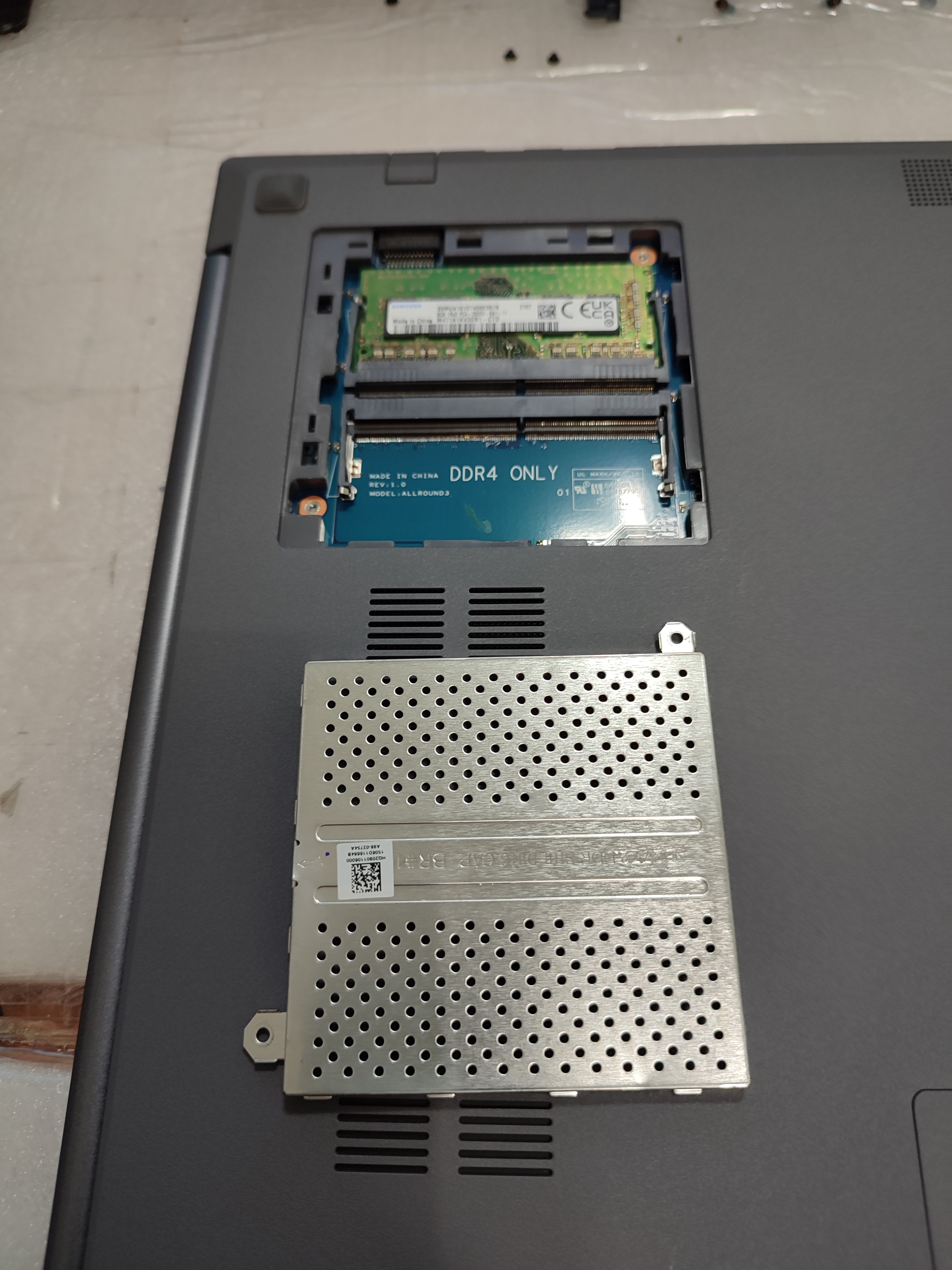 노트북을 분해한 내부모습입니다. 아래와 같이 4기가 메모리는 메인보드에 실장된 (납땜된) 모습이고요. 좌측으로 메모리 슬롯이 하나 더 가려져 있습니다.