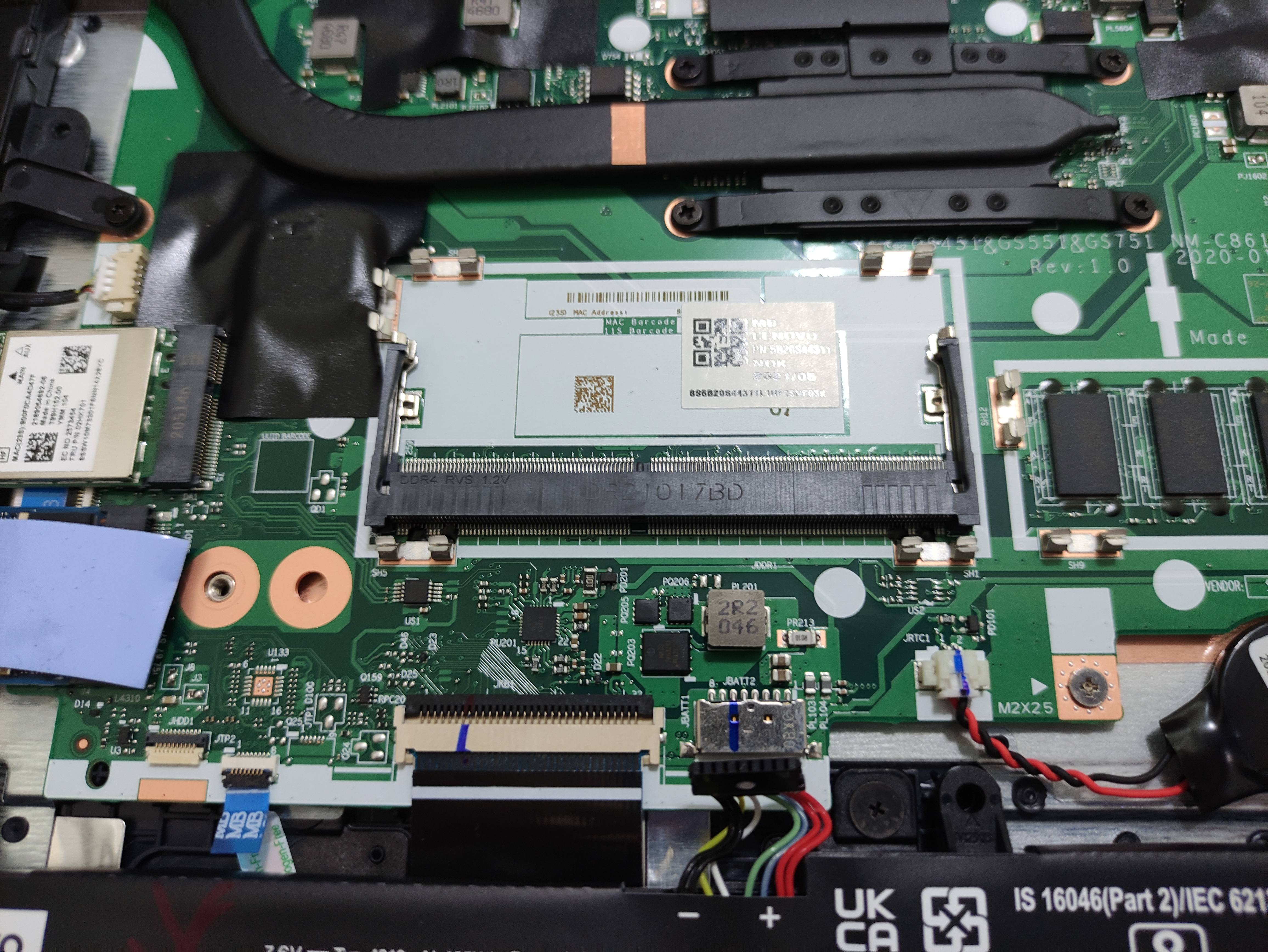 This is the inside view of the laptop disassembled. As shown below, 4 gigabytes of memory is soldered on the main board. Another memory slot is hidden on the left.