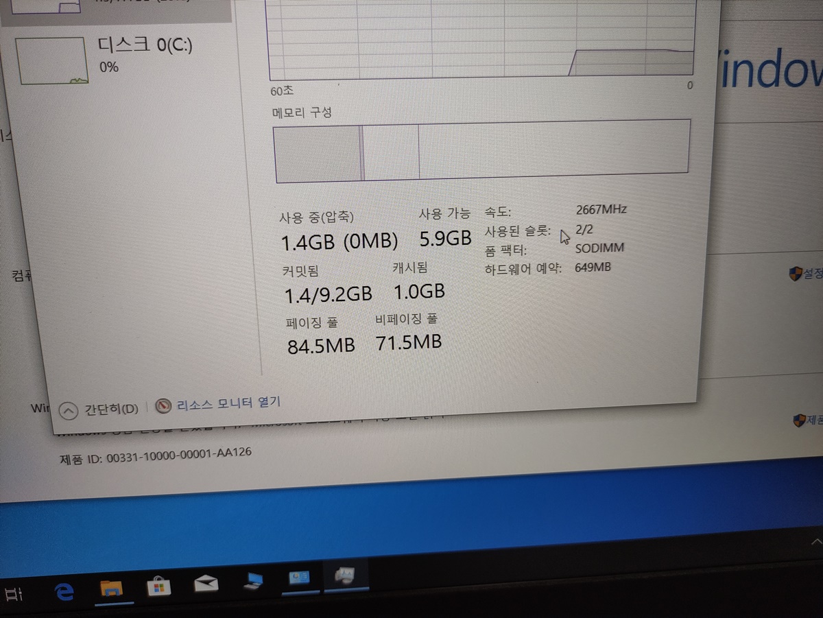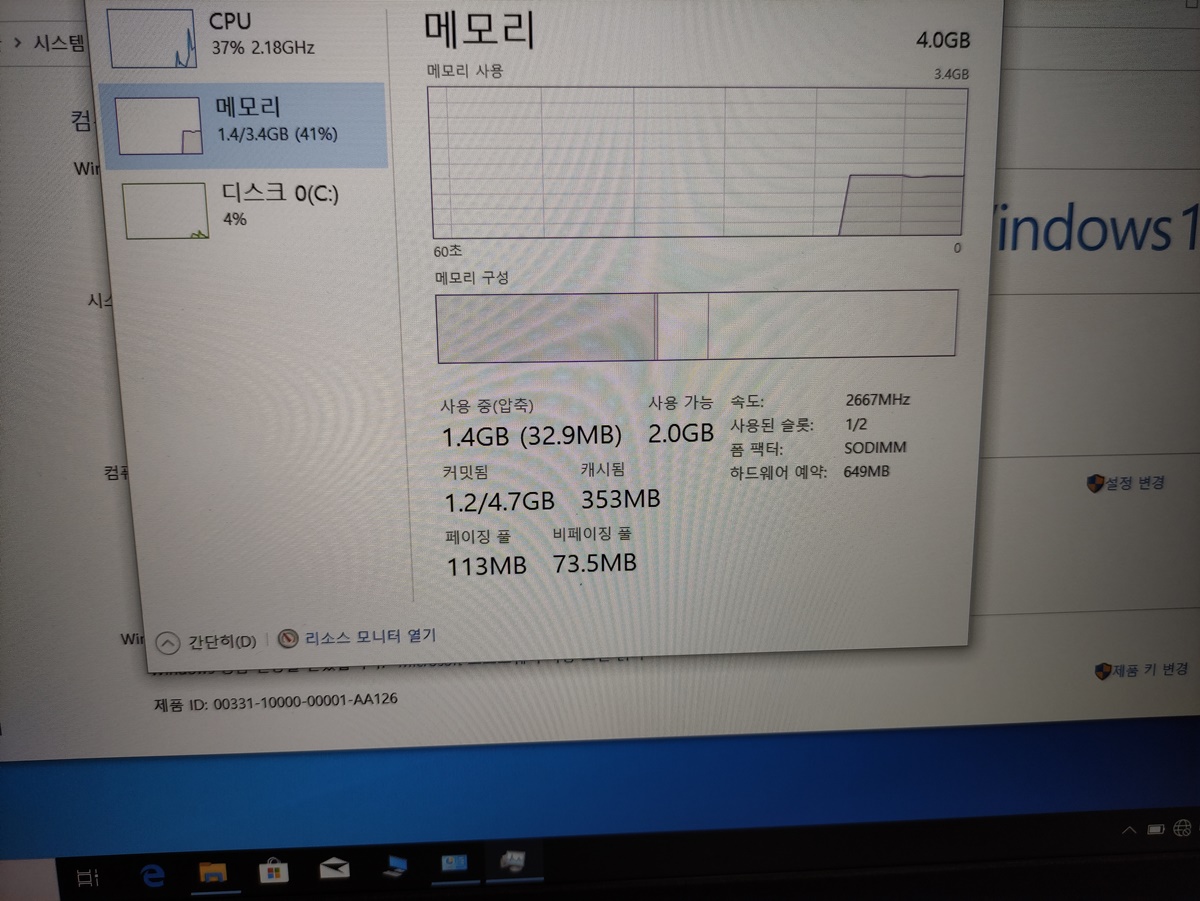 기존의 4기가 메모리로 동작할 당시에는 내장그래픽에서 0.6GB 정도를 미리 할당해서 사용하기 때문에 3.6GB 여유 공간이 있습니다. 그래서 이런 저런 작업을 진행하면, 금방 메모리가 90% 이상 올라갈 수 있습니다.